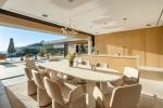 Amb una superfície aproximada de 1.520 m² distribuïts en tres nivells i complementada per 492 m² de terrasses, la vila ha estat dissenyada per integrar a la perfecció interiors sofisticats amb el seu espectacular entorn natural. Un llarg camí privat condueix a l’entrada principal, on una seqüència d’arribada dramàtica introdueix el caràcter arquitectònic refinat de l’habitatge. Un cop a dins, la llum natural inunda les àrees d’estar i menjador d’espai obert, centrades al voltant d’una moderna xemeneia i emmarcades per àmplies portes corredisses de terra a sostre que connecten sense esforç amb les terrasses exteriors. La cuina d’última generació està equipada amb electrodomèstics d’alta gamma i es complementa amb una discreta cuina secundària per al xef, la qual cosa permet tant un entreteniment elegant com la practicitat diària.