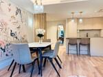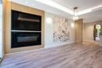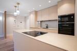 Im Zentrum der Wohnung befindet sich ein offener Wohnbereich, in dem sich Wohnzimmer und Essbereich nahtlos mit der modernen Küche verbinden und so eine praktische sowie einladende Atmosphäre schaffen. Ein Kamin verleiht dem Wohnzimmer Wärme und Charakter, während Einbauschränke in beiden Schlafzimmern für Komfort und zusätzliche Aufbewahrung sorgen.