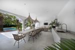 The villa comprises covered and sunny terraces with outdoor lounges, al fresco dining and barbecue areas, a saltwater pool with wooden decking, and a solarium surrounded by landscaped subtropical gardens.