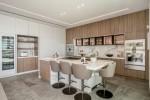 The gourmet kitchen combines function and style, boasting cutting-edge Gaggenau appliances and sleek cabinetry by Danespan. Nearby, a dedicated home office provides a peaceful environment for productivity.