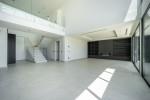 From the moment you enter, the villa impresses with light-filled interiors and a seamless connection between indoor and outdoor living. The entrance hall opens into a spacious open-plan living and dining area, centred around a sleek modern fireplace and framed by floor-to-ceiling windows that flood the space with natural light. Large sliding doors lead directly onto an expansive terrace of over 100 m², creating a fluid transition ideal for entertaining or relaxed everyday living. The contemporary open-plan kitchen is fully equipped with high-end appliances and designed to complement modern lifestyles. This level also includes a guest bedroom with en-suite bathroom and a guest toilet.