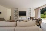 Floor-to-ceiling glass doors open directly onto the terrace and landscaped garden, where thoughtfully designed outdoor areas include shaded lounge spaces for summer comfort and an expansive swimming pool with sunbathing area, positioned to enjoy sunlight throughout the day.