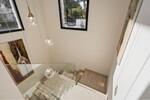 Inside, the home is defined by light-filled interiors and a calm, neutral palette. Expansive windows flood the living spaces with natural light, enhancing the connection between indoor and outdoor living. The ground floor features a stylish fully equipped kitchen with an adjoining utility room, direct access to a guest en-suite bedroom, and a spacious open-plan living and dining area. A contemporary double-sided fireplace acts as a central feature, subtly dividing the space while maintaining an open and flexible layout.