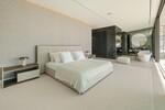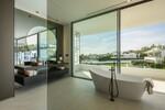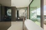 The upper level is dedicated to the bedroom suites, offering three beautifully designed bedrooms. The principal suite occupies the main façade, with sea-facing glazing, access to a private terrace, and a refined bathroom featuring a freestanding bathtub and integrated dressing area. Two additional guest suites follow the same understated design language, combining natural light, clean lines, and a sense of quiet sophistication.