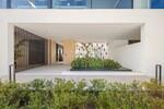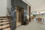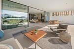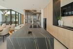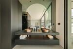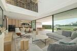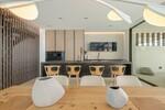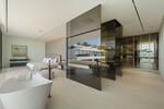 The entrance opens into a striking double-height living space, centred around a beautifully designed interior courtyard where a mature olive tree rises as a natural focal point. This unique architectural feature brings light and character into the heart of the home, around which the main living areas are arranged. The open-plan layout seamlessly connects the kitchen, dining, and lounge spaces, all framed by floor-to-ceiling sliding glass doors that extend naturally onto the terraces. Oak cabinetry, pale stone flooring, and subtle lighting create a calm and elegant atmosphere throughout.