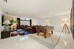 La villa ofrece varios dormitorios en suite de lujo, cada uno con acceso directo a terrazas que amplían el espacio habitable al exterior. Múltiples zonas de estar proporcionan flexibilidad para la relajación y reuniones sociales, mientras que una sala de entretenimiento dedicada, con asientos confortables e iluminación ambiental, crea el entorno perfecto para noches de cine en casa.