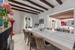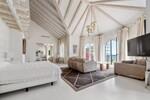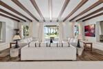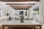 La villa se presenta con un impresionante vestíbulo de doble altura, donde las vigas de madera expuestas y una lámpara de araña de diseño imponen un tono elegante. Las áreas principales son generosas y equilibradas, destacando dos salones sofisticados que se abren a una amplia terraza cubierta con orientación al mar, creando una perfecta transición entre el interior y el exterior. Un comedor formal y una cocina contemporánea y luminosa con isla central completan el nivel principal.