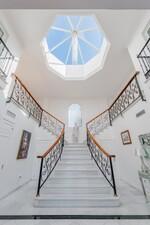 Het elegante landhuis in mediterrane stijl in Porto da Torre, met brede geplaveide buitenruimtes, tuinen en elegante interieurs verdeeld in drie niveaus. De behuizing verwelkomt een klassieke vestibule, voorgezeten door een imposante dubbele witte marmeren trap die in twee richtingen opent. Gesmede ijzeren leuningen met decoratieve details, samen met houten loopbruggen, zorgen voor verfijnde en tijdloze lucht. Een grote achthoekige helderheid op de top overstroomt de ruimte van natuurlijk licht, verder realiseren van zijn amplitude, terwijl een klassieke sculptuur gelegen in de centrale rellano versterkt de elegantie van de set.