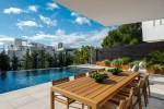 De hoofdwoonruimtes zijn opgezet in een open indeling die licht en ruimtelijkheid bevordert. Grote glazen schuifdeuren verbinden het interieur naadloos met een privéterras met zwembad, waardoor een moeiteloze binnen-buitenlevensstijl ontstaat die ideaal is voor zowel dagelijks gebruik als voor het ontvangen van gasten.