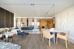 Vid entrén möts man av en elegant hall som öppnar upp mot ett spektakulärt vardagsrum, omsorgsfullt uppdelat i två distinkta zoner. Ena sidan erbjuder ett elegant vardagsrum och matsal kompletterat med gästtoalett, medan den andra sidan bjuder på en mer intim loungemiljö centrerad kring en modern öppen spis. Designermöbler och en imponerande, klimatkontrollerad vinkällare skapar en inbjudande atmosfär idealisk för både avkoppling och umgänge. Det separata köket är fullt utrustat med toppmoderna vitvaror och inkluderar en praktisk serviceyta samt bar, vilket kombinerar funktionalitet med sofistikerad design.