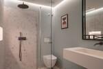 Interiören är genomgående färdigställd med material av hög kvalitet, med särskild omsorg om kök och badrum för att skapa en ren och modern estetik. Golvvärme löper genom hela bostaden och säkerställer komfort året runt.